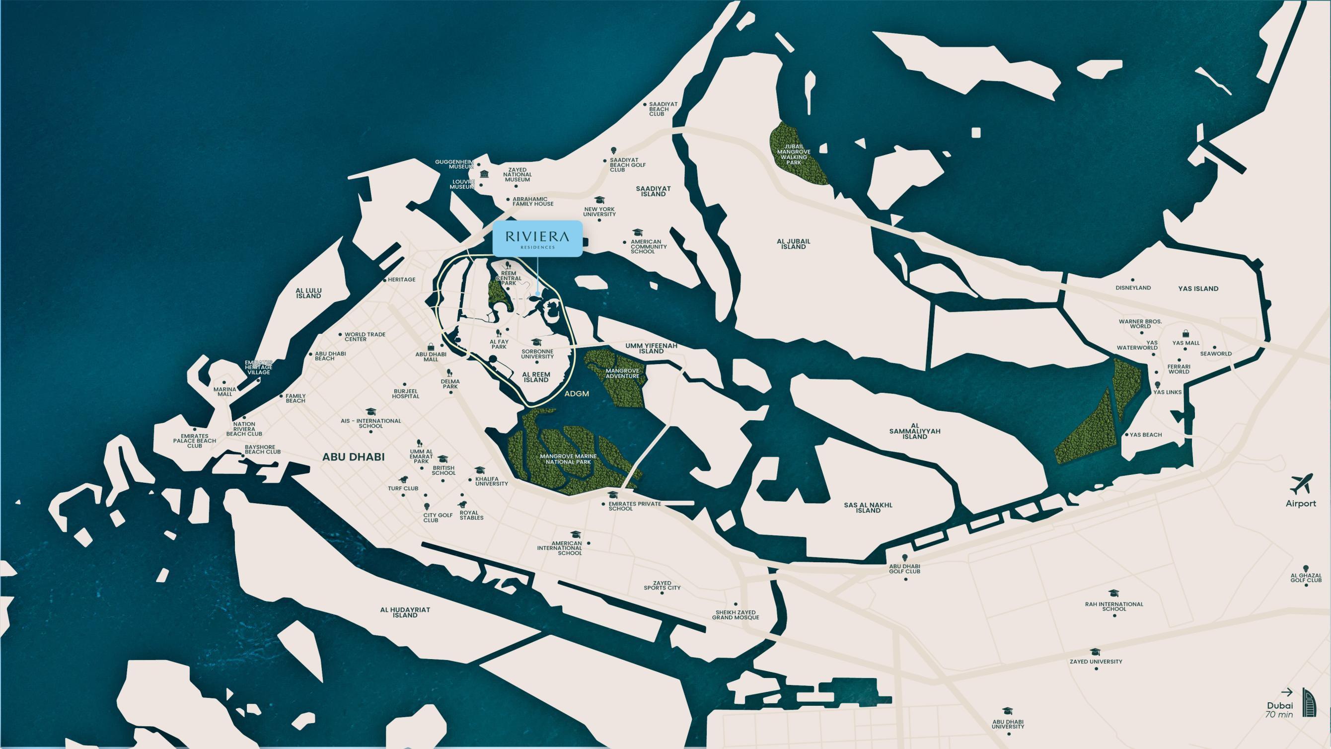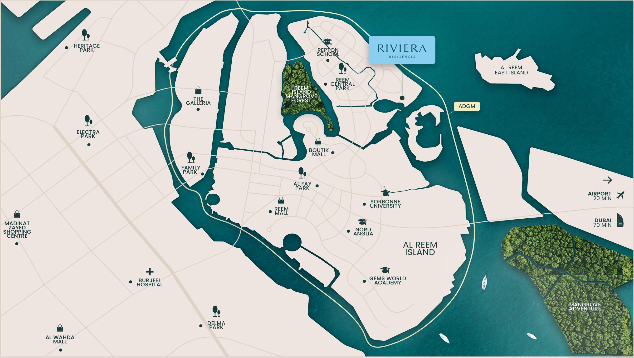 Riviera Residences on Al Reem Island, Abu Dhabi, is close to key landmarks including Reem Mall, Sorbonne University Abu Dhabi, Abu Dhabi Corniche, Marina Mall, and major business hubs, offering unmatched convenience for shopping, dining, education, and leisure.